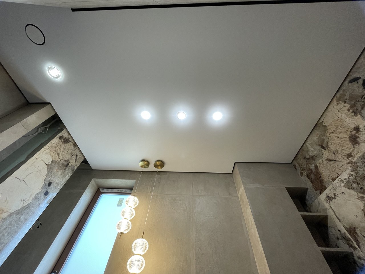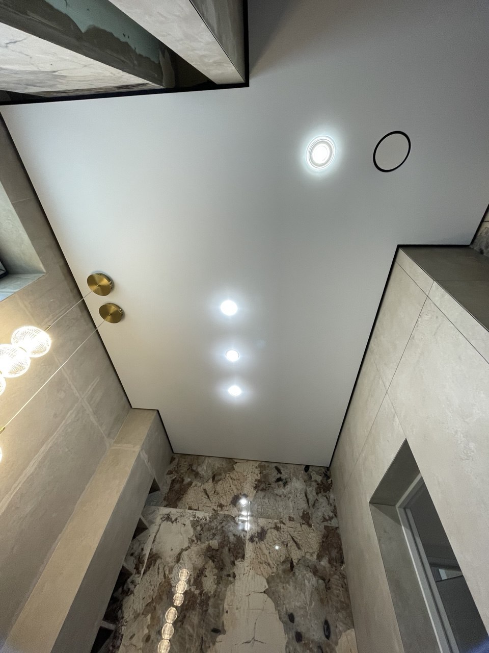 Завершили монтаж натяжного потолка в ванной комнате. Мы реализовали стильное теневое примыкание, которое создает аккуратный и современный вид, с идеально ровным зазором по всему периметру. Для освещения зоны зеркала подобрали два элегантных свисающих светильника, а в душевой зоне установили незаметную, но эффективную скрытую теневую вытяжку.