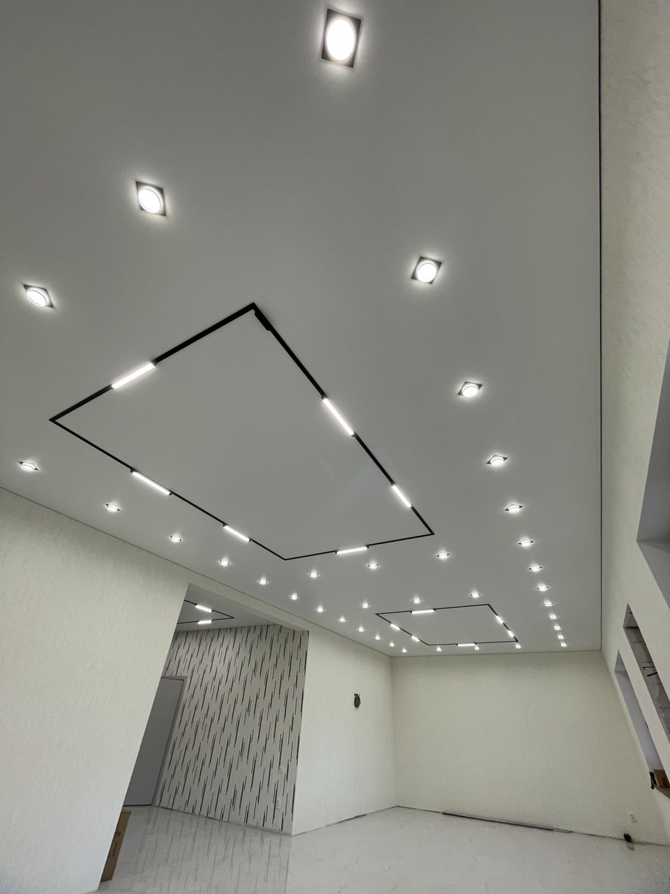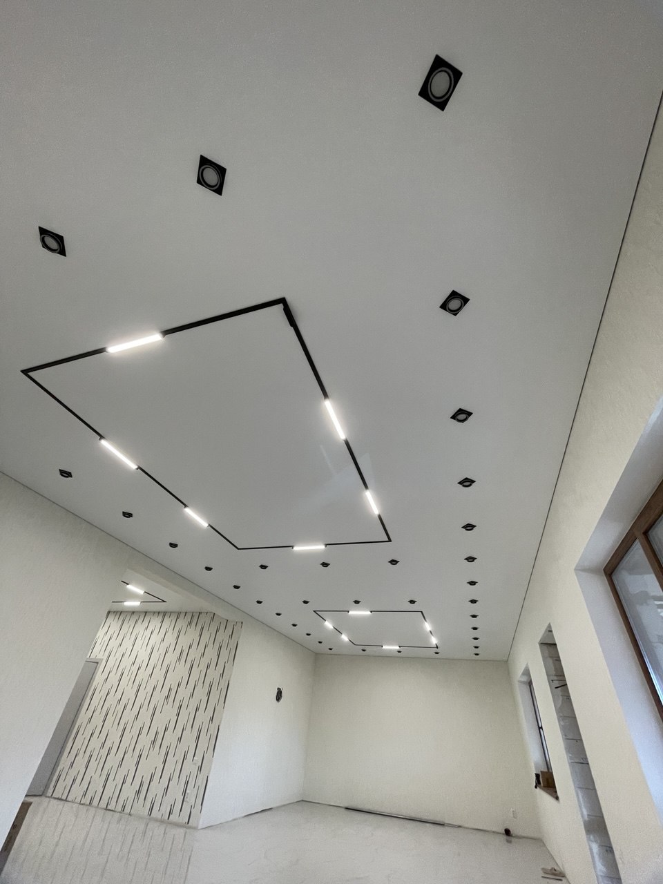 Теперь в кухне-столовой установлен новый натяжной потолок. Мы выбрали классический белый цвет, который визуально расширяет пространство. Особое внимание уделили современному решению – теневому вентилируемому примыканию, которое обеспечивает аккуратный вид и правильную циркуляцию воздуха. Для функционального разделения помещения на кухонную и обеденную зоны мы использовали трековое освещение. А для создания яркого и направленного света в обеих зонах установлены элегантные черные наружные споты.