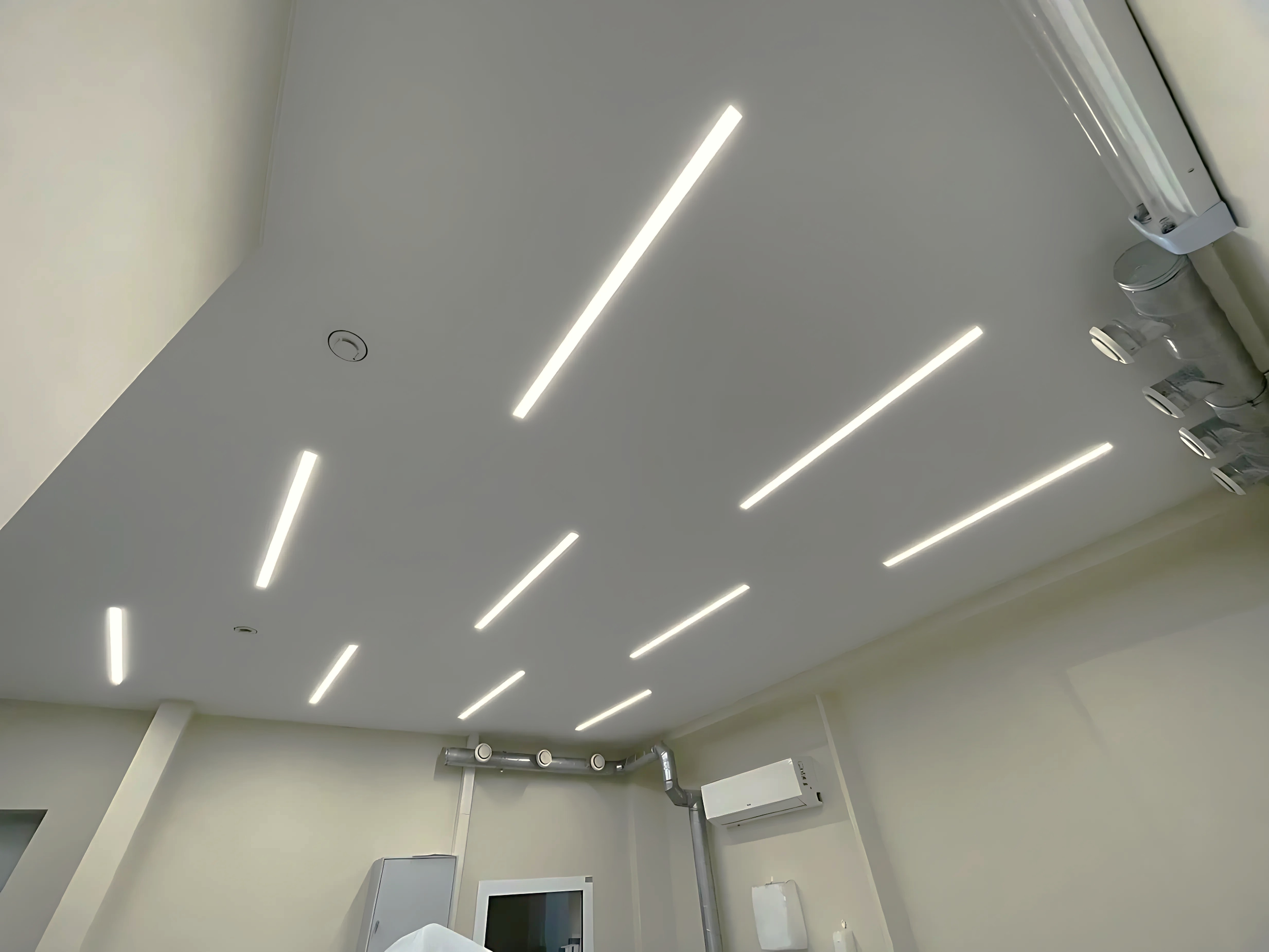 Для коммерческого помещения мы предлагаем современное решение – негорючий потолок КМ1. Он не только соответствует всем требованиям пожарной безопасности, но и станет стильным элементом интерьера благодаря интегрированным световым линиям, которые обеспечат основное, равномерное освещение."