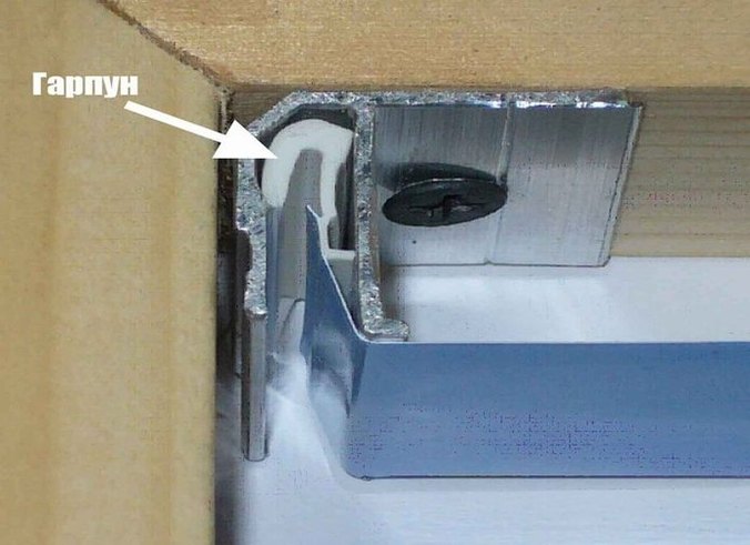 Эта система монтажа состоит из профиля (алюминиевый или пластиковый) пленки ПВХ ,гарпуна из более толстого пвх.Гарпун с помощью ТВЧ станка припаеваеться к пленке ПВХ,защелкиваеться в профиле,где удерживает полотно